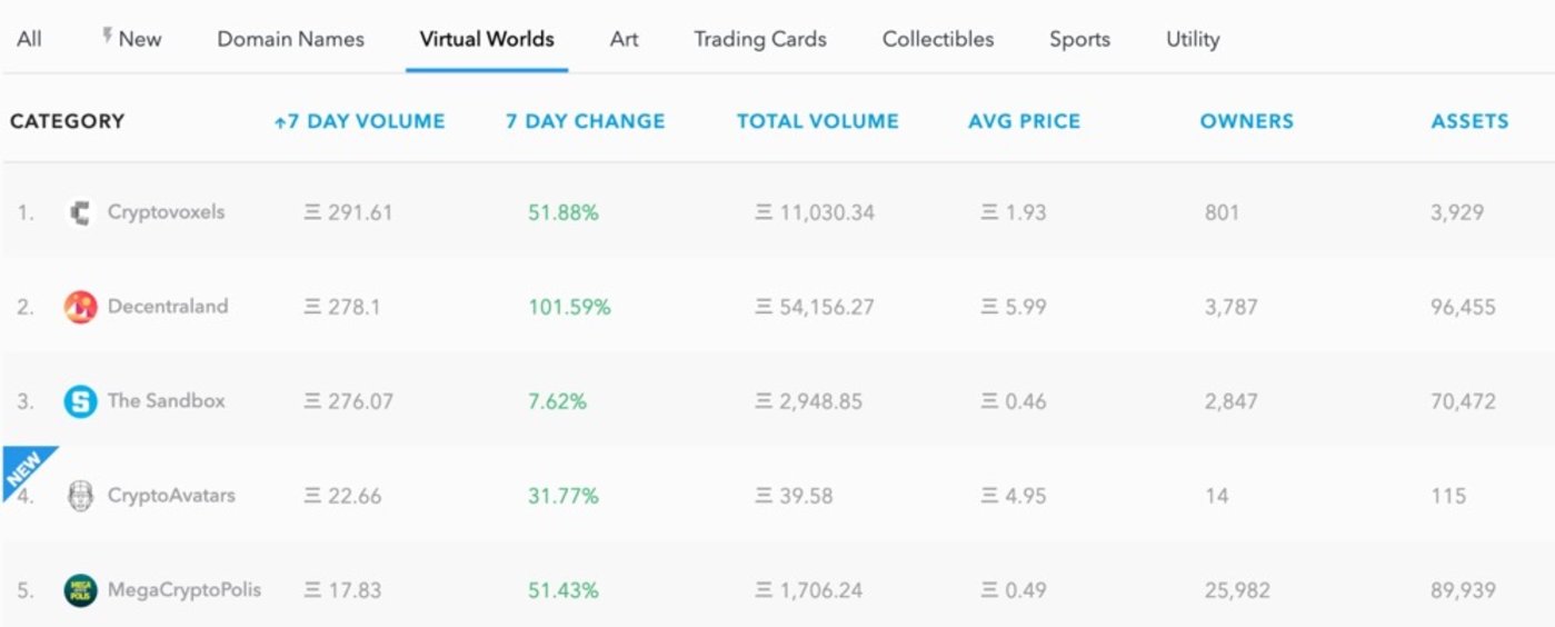 OpenSea上虚拟世界类NFT产品排名前五分别是Decentraland、Cryptovoxels、Somnium Space VR、MegaCryptoPolis、Decentraland Wearables。